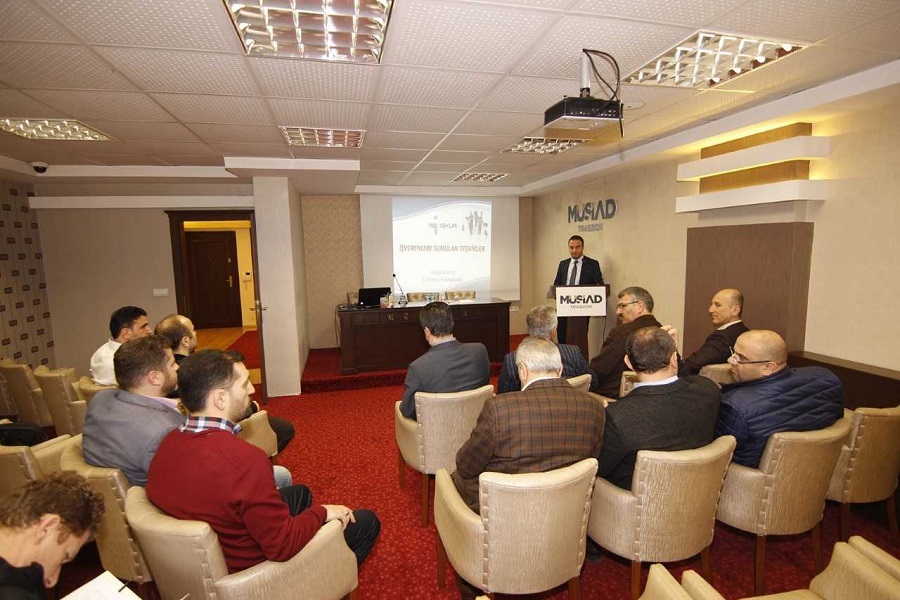 Trabzon Çalışma ve İş Kurumu İl Müdür Vekilimiz İbrahim Büyük, İl Müdür Yardımcımız Servet Kaba, Trabzon Sosyal Güvenlik Kurumu Merkez Şube Müdürü Ersin Demirel MÜSİAD toplantı salonunda gerçekleştirilen sunumda MÜSİAD Trabzon Şube Başkanı Ali Kaan ve yönetim kurulu üyelerinin katılımıyla gerçekleştirildi. İŞKUR ve SGK Uzmanları tarafından gerçekleştirilen sunumda Sigorta Teşviki, Yarım Çalışma Ödeneği, Ücret Garanti Fonu, Kısa Çalışma Ödeneği, Engelli İstihdam Teşviki, İlave İstihdam Sigorta Teşviki, İşbaşı Eğitim Programı, İşe İlk Adım Projesi, Mesleki Eğitim Kursları ve MEGİP Projesi tanıtıldı.